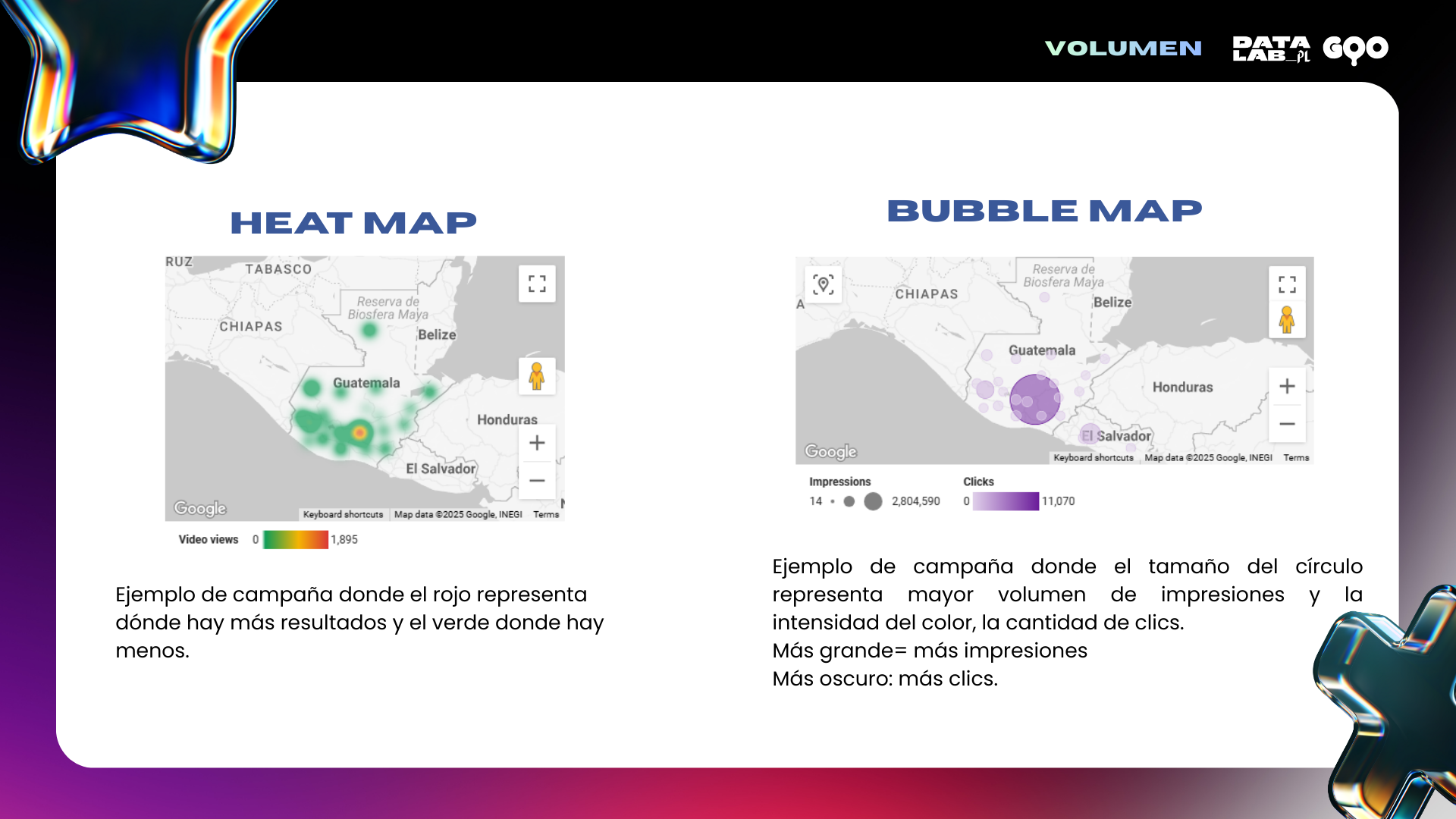 Tamaño de la burbuja: volumen (como impresiones, ventas, clics, interacciones).
