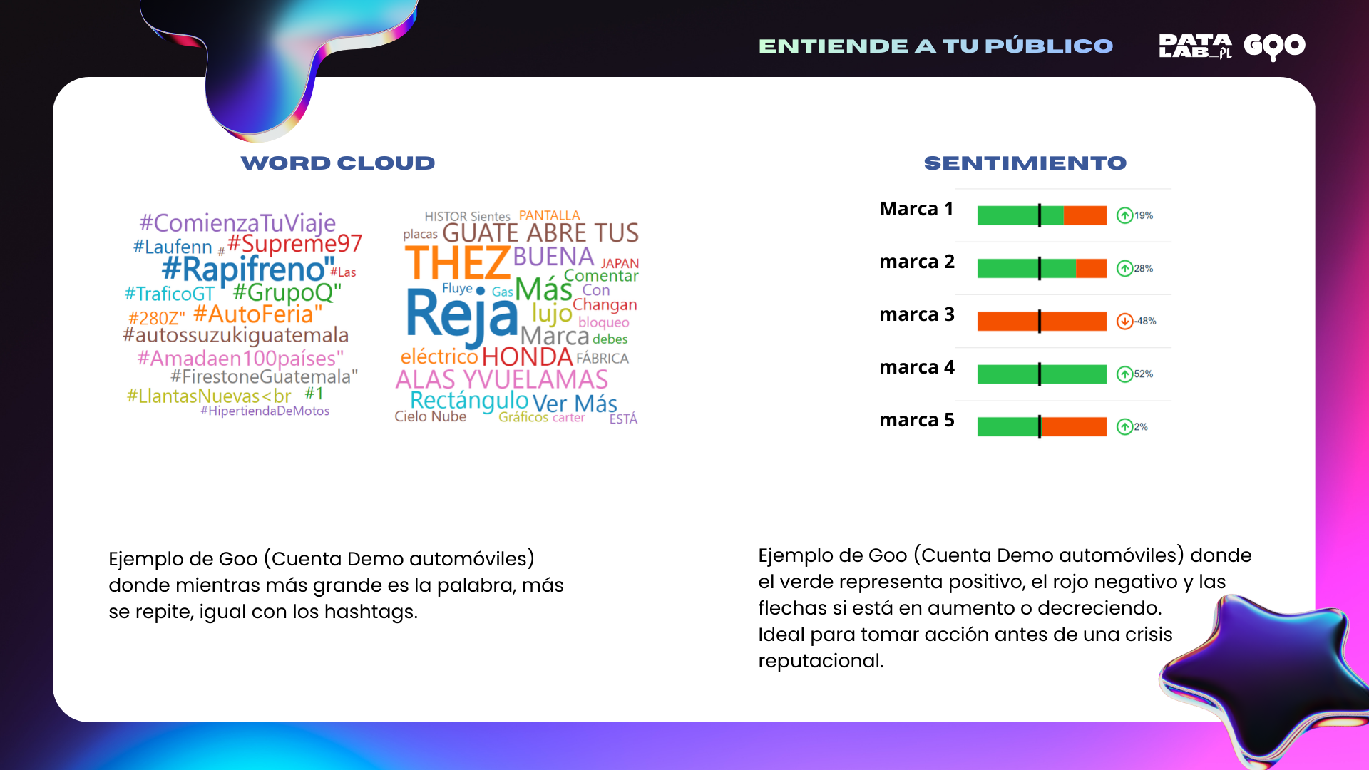 Con Goo, puedes interpretar visualizaciones clave para: