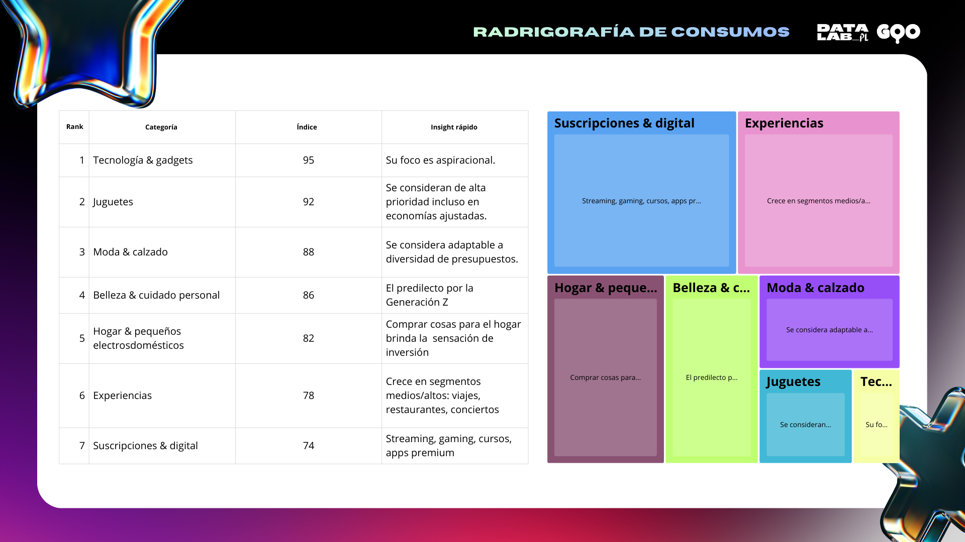 Finalmente, las experiencias y suscripciones digitales (74/100) vienen creciendo, especialmente en segmentos jóvenes y urbanos: cenas, escapadas, conciertos, streaming, gaming y cursos online.