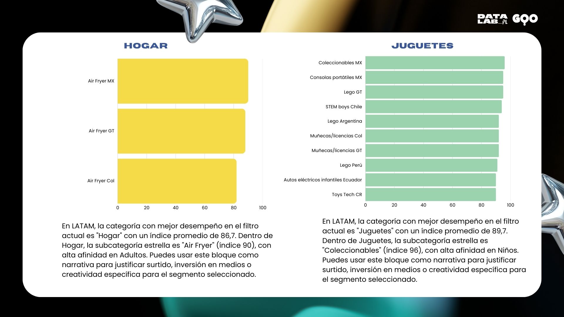 La categoría de juguetes y productos para niños (92/100) se mantiene con una fuerte carga emocional, ya que el principal detonante de búsqueda son los regalos educativos para niños.